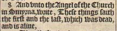 8 And vnto the Angel of the Church in Smyrna, write, These things saith the first and the last, which was dead, and is aliue,