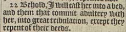 22 Behold, I will cast her into a bed, and them that commit adultery with her, into great tribulation, except they repent of their deeds.