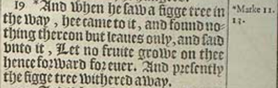 19 *And when he saw a figge tree in the way, hee came to it, and found nothing thereon but leaues only, and said vnto it, Let no fruite growe on thee hence forward for euer. And presently the figge tree withered away.[*Marke 11.13.]
