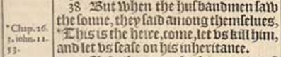 38 But when the husbandmen saw the sonne, they said among themselues, *This is the heire, come, let vs kill him, and let vs sease on his inheritance.[*Chap. 26.3. iohn. 11.53.]
