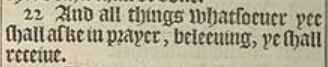 22 And all things whatsoeuer yee shall aske in prayer, beleeuing, ye shall receiue.