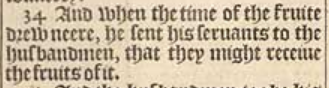 34 And when the time of the fruite drew neere, he sent his seruants to the husbandmen, that they might receiue the fruits of it.