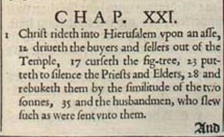1 Christus reitet auf einem Esel nach Jerusalem hinein, 12 treibt die Käufer und Verkäufer aus dem Tempel, 17 verflucht den Feigenbaum, 23 bringt die Priester und Ältesten zum Schweigen, 28 und tadelt sie mit der Parabel der zwei Söhne, 35 und die Landwirte, die jene erschlugen, die zu ihnen geschickt wurden.