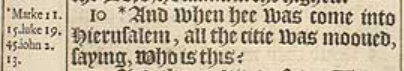 10 *And when hee was come into Hierusalem, all the citie was mooued, saying, Who is this?[*Marke 11.15. luke 19.45. iohn 2.13.]