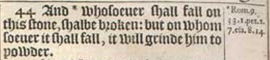 44 And *whosoeuer shall fall on this stone, shalbe broken: but on whom soeuer it shall fall, it will grinde him to powder.[*Rom. 9.33. 1. pet. 2.7. esa. 8.14.]