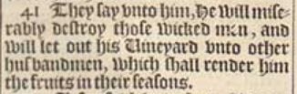 41 They say vnto him, He will miserably destroy those wicked men, and will let out his Uineyard vnto other husbandmen, which shall render him the fruits in their seasons.