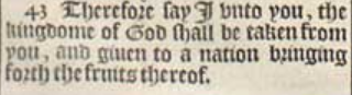 43 Therefore say I vnto you, the kingdome of God shall be taken from you, and giuen to a nation bringing forth the fruits thereof.