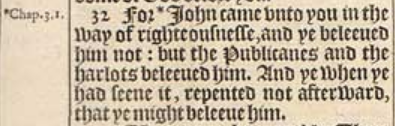 32 For *Iohn came vnto you in the way of righteousnesse, and ye beleeued him not: but the Publicanes and the harlots beleeued him. And ye when ye had seene it, repented not afterward, that ye might beleeue him.[*Chap. 3.1.]