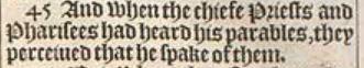 45 And when the chiefe Priests and Pharisees had heard his parables, they perceiued that he spake of them.