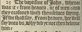 25 The baptisme of Iohn, whence was it? from heauen, or of men? and they reasoned with themselues saying, If we shall say, From heauen, hee will say vnto vs, Why did ye not then beleeue him?