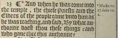23 ¶ *And when he was come into the temple, the chiefe Priests and the Elders of the people came vnto him as he was teaching, and said, By what authoritie doest thou these things? and who gaue thee this authoritie?[*Marke 11.27. luke 20.1.]