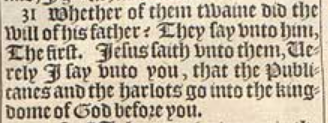 31 Whether of them twaine did the will of his father? They say vnto him, The first. Iesus saith vnto them, Uerely I say vnto you, that the Publicanes and the harlots go into the kingdome of God before you.