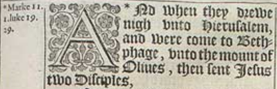 1 *And when they drewe nigh vnto Hierusalem, and were come to Bethphage, vnto the mount of Oliues, then sent Iesus two Disciples,[*Marke 11.1. luke 19.29.]