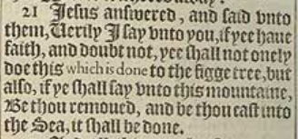 21 Iesus answered, and said vnto them, Uerily I say vnto you, if yee haue faith, and doubt not, yee shall not onely doe this which is done to the figge tree, but also, if ye shall say vnto this mountaine, Be thou remoued, and be thou cast into the Sea, it shall be done.