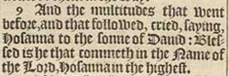 9 And the multitudes that went before, and that followed, cried, saying, Hosanna to the sonne of Dauid: Blessed is he that commeth in the Name of the Lord, Hosanna in the highest.