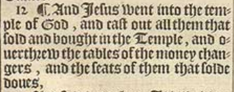 12 ¶ And Iesus went into the temple of God, and cast out all them that sold and bought in the Temple, and ouerthrew the tables of the money changers, and the seats of them that solde doues,