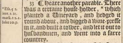 33 ¶ Heare another parable. There was a certaine house-holder, *which planted a Uineyard, and hedged it round about, and digged a wine-presse in it, and built a tower, and let it out to husbandmen, and went into a farre countrey.[*Esa. 5.1. iere. 2.21. mark. 12.1. luke 20.9.]