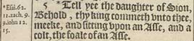 5 *Tell yee the daughter of Sion, Behold, thy king commeth vnto thee, meeke, and sitting vpon an Asse, and a colt, the foale of an Asse.[*Esai. 62.11. zach. 9.9. iohn 12.15.]
