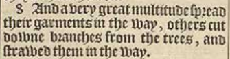 8 And a very great multitude spread their garments in the way, others cut downe branches from the trees, and strawed them in the way.