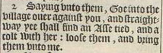 2 Saying vnto them, Goe into the village ouer against you, and straightway yee shall find an Asse tied, and a colt with her: loose them, and bring them vnto me.