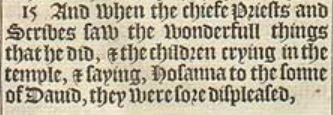 15 And when the chiefe Priests and Scribes saw the wonderfull things that he did, & the children crying in the temple, & saying, Hosanna to the sonne of Dauid, they were sore displeased,