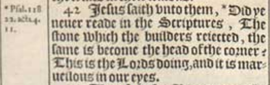 42 Iesus saith vnto them, *Did ye neuer reade in the Scriptures, The stone which the builders reiected, the same is become the head of the corner? This is the Lords doing, and it is marueilous in our eyes.[*Psal. 118.22. acts. 4.11.]