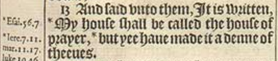 13 And said vnto them, It is written, *My house shall be called the house of prayer, *but yee haue made it a denne of theeues.[*Esai. 56.7. , *Iere 7.11. mar. 11.17. luke. 19.46.]