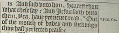 16 And said vnto him, Hearest thou what these say? And Iesus saith vnto them, Yea, haue yee neuer read, *Out of the mouth of babes and sucklings thou hast perfected praise?[*Psal. 8.2.]