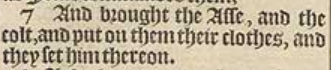 7 And brought the Asse, and the colt, and put on them their clothes, and they set him thereon.