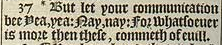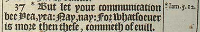 37 *But let your communication bee Yea, yea: Nay, nay: For whatsoeuer is more then these, commeth of euill.[*Iam.5.12.]