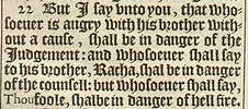 22 But I say vnto you, that whosoeuer is angry with his brother without a cause, shall be in danger of the Iudgement: and whosoeuer shall say to his brother, Racha, shal be in danger of the counsell: but whosoeuer shall say, Thou foole, shalbe in danger of hell fire.