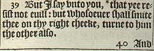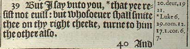 39 But I say vnto you, *that yee resist not euill: but whosoeuer shall smite thee on thy right cheeke, turne to him the other also.[*Luke 6. 29. rom.12. 17. 1.cor.6. 7.]