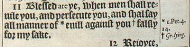 11 Blessed are ye, when men shall reuile you, and persecute you, and shal say all manner of *euill against you+falsly for my sake.[*1.Pet.4. 14. ,+ Gr. lying.]