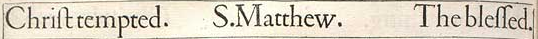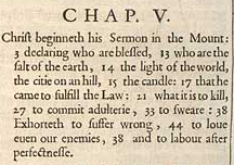 Christ beginneth his Sermon in the Mount: 3 declaring who are blessed, 13 who are the salt of the earth, 14 the light of the world, the citie on an hill, 15 the candle: 17 that he came to fulfill the Law: 21 what it is to kill, 27 to commit adulterie, 33 to sweare: 38 Exhorteth to suffer wrong, 44 to loue euen our enemies, 38 and to labour after perfectnesse.
