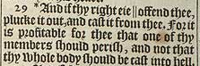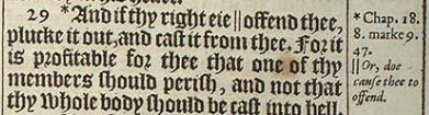 29 *And if thy right eie || offend thee, plucke it out, and cast it from thee. For it is profitable for thee that one of thy members should perish, and not that thy whole body should be cast into hell.[*Chap. 18. 8. marke 9. 47. , ||Or, doe cause thee to offend.]