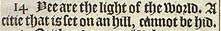 14 Yee are the light of the world. A citie that is set on an hill, cannot be hid.