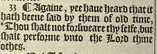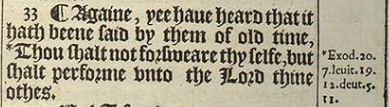 33 ¶ Againe, yee haue heard that it hath beene said by them of old time, *Thou shalt not forsweare thy selfe, but shalt performe vnto the Lord thine othes.[*Exod.20 7. leuit. 19.12. deut.5. 11.]
