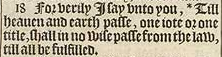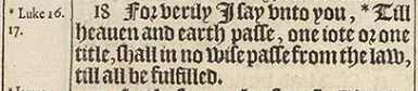 18 For verily I say vnto you, *Till heauen and earth passe, one iote or one title, shall in no wise passe from the law, till all be fulfilled.[*Luke 16. 17.]