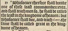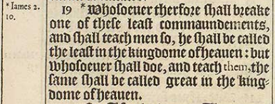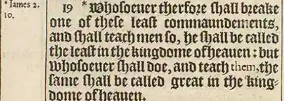 19 Whosoeuer therfore shall breake one of these least commaundements, and shall teach men so, he shall be called the least in the kingdome of heauen: but whosoeuer shall doe, and teach them, the same shall be called great in the kingdome of heauen.[Iames 2. 10.d]