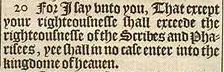 20 For I say vnto you, That except your righteousnesse shall exceede the righteousnesse of the Scribes and Pharisees, yee shall in no case enter into the kingdome of heauen.