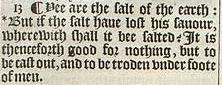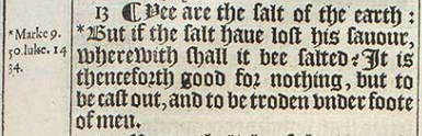 13 ¶ Yee are the salt of the earth: *But if the salt haue lost his sauour, wherewith shall it bee salted? It is thenceforth good for nothing, but to be cast out, and to be troden vnder foote of men.[*Marke 9. 50 luke. 14 34.]