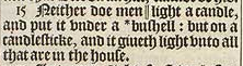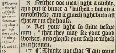 15 Neither doe men || light a candle, and put it vnder a *bushell: but on a candlesticke, and it giueth light vnto all that are in the house. [||The word in the originall signifieth a measure containing about a pint lesse then a pecke., *Marke 4. 21 luke 8.16. and 11. 33.]