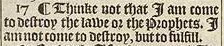 17 ¶ Thinke not that I am come to destroy the lawe or the Prophets. I am not come to destroy, but to fulfill.