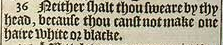 36 Neither shalt thou sweare by thy head, because thou canst not make one haire white or blacke.