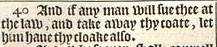 40 And if any man will sue thee at the law, and take away thy coate, let him haue thy cloake also.