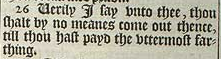 26 Uerily I say vnto thee, thou shalt by no meanes come out thence, till thou hast payd the vttermost farthing.