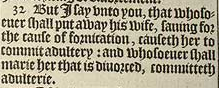 32 But I say vnto you, that whosoeuer shall put away his wife, sauing for the cause of fornication, causeth her to commit adultery: and whosoeuer shall marie her that is diuorced, committeth adulterie.