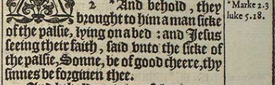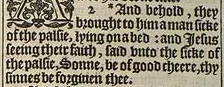 2 *And behold, they brought to him a man sicke of the palsie, lying on a bed: and Iesus seeing their faith, said vnto the sicke of the palsie, Sonne, be of good cheere, thy sinnes be forgiuen thee.[*Marke 2.3 luke 5.18.]