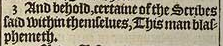 3 And behold, certaine of the Scribes said within themselues, This man blasphemeth.