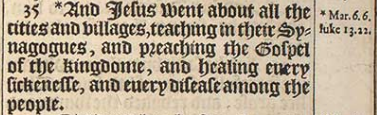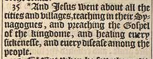 35 *And Iesus went about all the cities and villages, teaching in their Synagogues, and preaching the Gospel of the kingdome, and healing euery sickenesse, and euery disease among the people.[*Mar.6.6. luke 13.22.]
